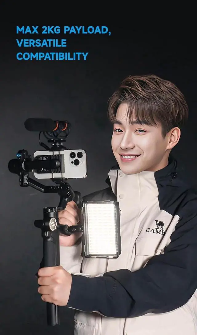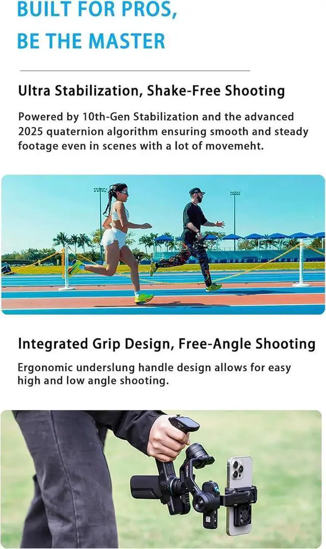 Built for Pros, Be the MasterIntegrated ergonomic grip design allows for easy high and low angle shooting. Max battery runtime up to 14 hours. The 3-axis lock now features a buckle design, allowing for a smoother and quicker setup.