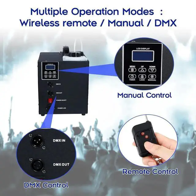 Control Modes: Wireless remote /Manual / DMX. It is more convenient to use, great for creating an exciting visual effect for Halloween, weddings or party, stage performance, DJ club, dance halls, discos, etc. Built-in DMX allow precise operation, more convenient to control the fog volume.