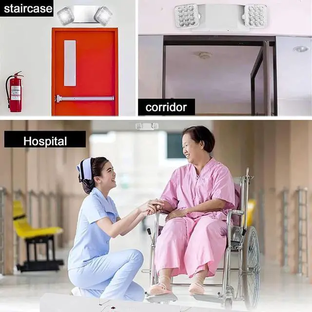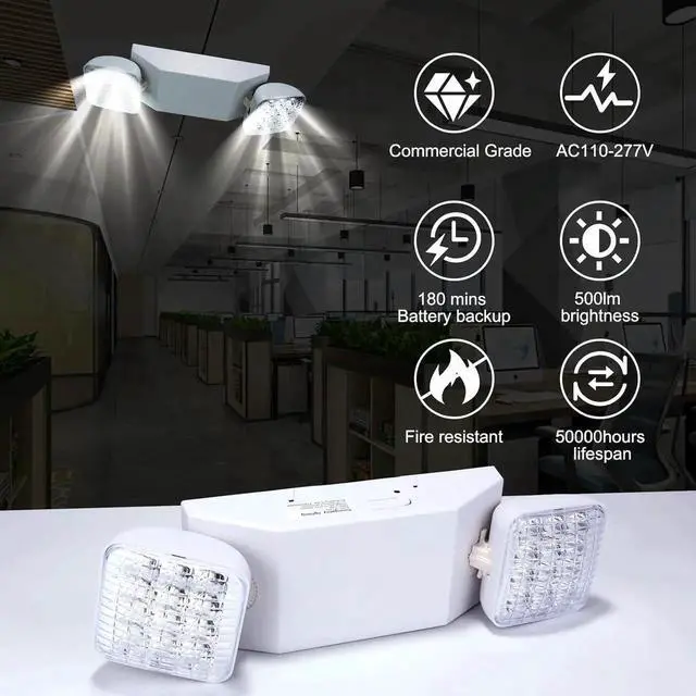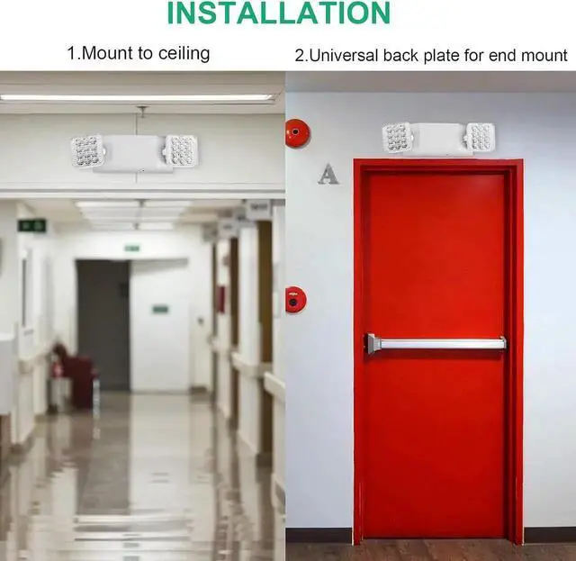- Good quality Material and Applications: Our commercial emergency lights are constructed of engineering-grade and injection-molded thermoplastic for exceptional toughness. Emergency backup lights are also flame retardant to prevent fire and limit its spread. Great for placing on stairways, hallways, doorways, isles, restaurant, office building and warehouses, Parking lot school hotel restuatant churches. --How do test the product is working? -- When turn on the power, Only the indicator lights up. When turn off the power, the indicator light is off, 2 light head lights