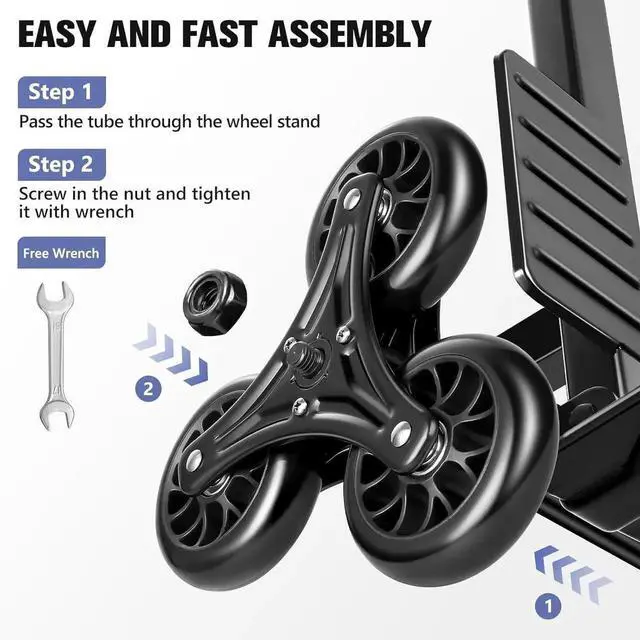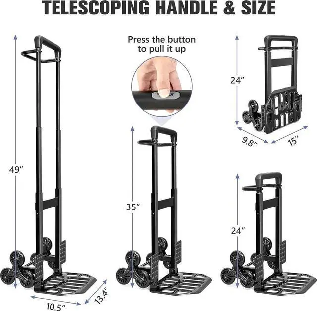 3 Different Height Adjustments & Max Height 49.2 inchThe stair climber cart has 3-level telescoping handle. You can adjust the hand truck to find the push-hold posture that best suits your height. The handle of stair dolly cart with wheels have 49.2 inches, which is very friendly to tall people. saying goodbye to the back pain caused by hunching over
