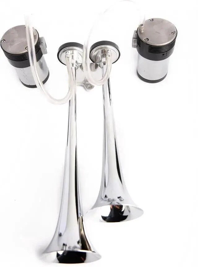 , 2-Trumpets Loud Sound at 129dB, Compact Air- Horn-Kit. Trumpets are chrome plated metal. Universal fit for Truck, Car, RV, SUV, Pick-Up, and Marine Boats. Comes with 2 Heavy-Duty Maintnce Free 12volt Air-Compressors, Mounting-Brackets, Hardware, Air Hoses, Relay, and installation instructions. Easily installs in any vehicle. Considering the condensed limited space under the hood in today's vehicles, this Air-Horn-kit is compact in size and does not require a lot of space. It will surely produce a much louder sound than the factory's wimpy horn.