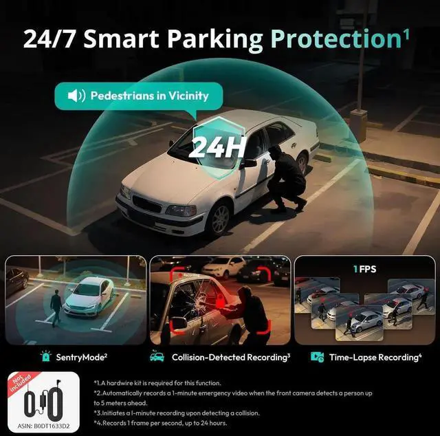 Super Capacitor Dash Cam features a high-temperature-resistant super capacitor, delivering ultra-wide operating range (-20 to 70) and 10x longer lifespan than traditional batteriesensuring uninterrupted operation in extreme weather. When paired with a hardwire kit (ASIN: B0DT1633D2), it enables 24/7 parking surveillance without compromising reliability.