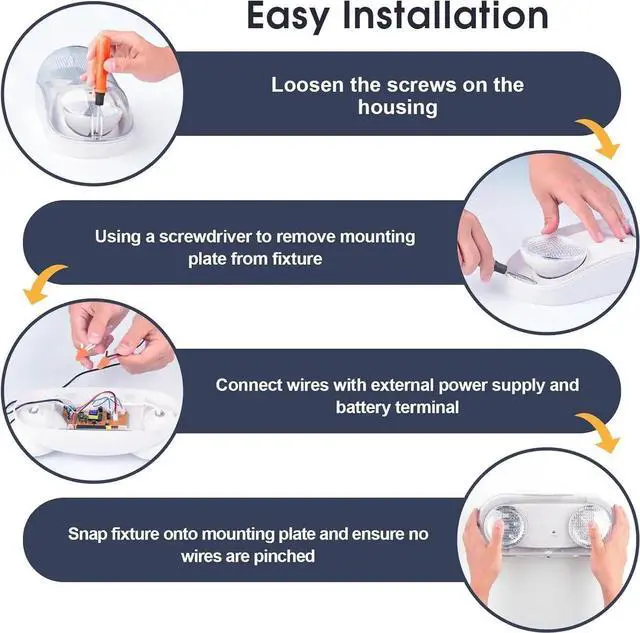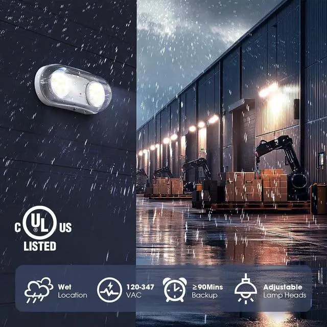: 120V-347V universal voltage, Backup Battery, Test switch and indicatorUL Listed&Wide ApplicationThe waterproof emergency exit lights approved by UL 924 certificate and comply with commercial grade. Its wet rated design makes it perfect for outdoor use, standing up to various weather conditionsEnsured Quality & Service All SASELUX Outdoor Emergency Light covered by worry-free MONEY-BACK & WARRANTY policy which support 5years for electrical boards and housing with professional after-sales service- Wet Location Rated & Fully Adjustable Two HeadsThe Wet Location emergency light with removable waterproof EVA foam protective covers prevent most water, UL-94V-0 Flame-retardant and high impact thermoplastic emergency light available in Wet location with seamless silicon gasket. 360 degree rotation Adjustable lamp heads allow this emergency light to be pointed in any direction needed.