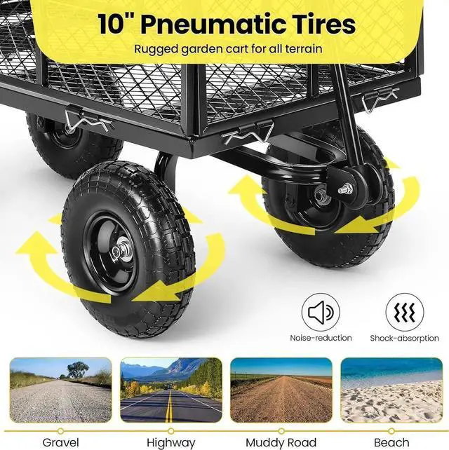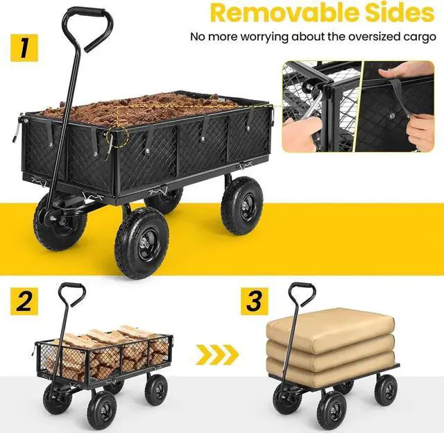 DURABLE STEEL WAGON: Consist of fully-welded powder-coated steel frame and iron mesh frame, the metal wagon is very solid and can withstand harsh outdoor conditions. Made fully-welded, high-quality metal, the cart body is anti-rust, solid; All-iron mesh bed is extremely tough and not easy to break; The hinges between each rail are sturdy and firmly-welded to ensure a long service life; This garden cart with premium materials and professional craftsmanship, with stronger load-bearing capacity.