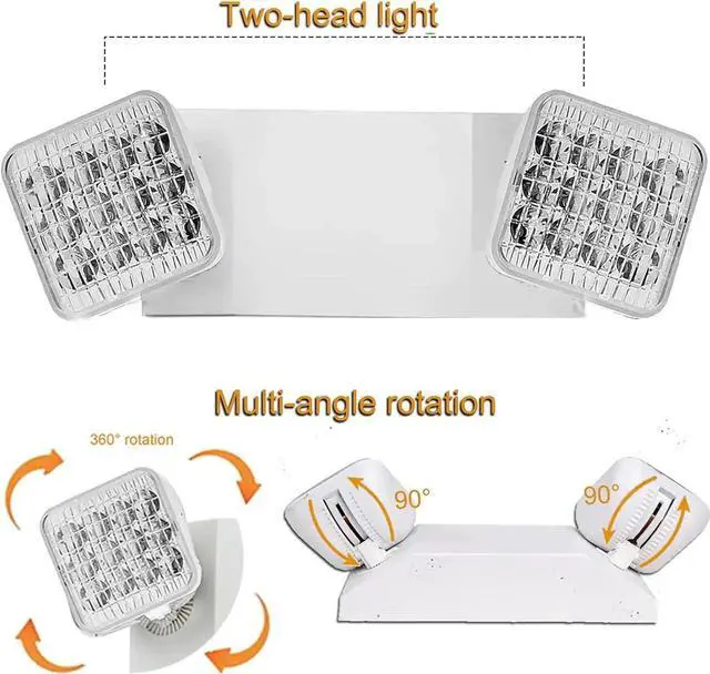 - Adjustable-angle lighting: 2*3W Dual head emergency light fixture Use long-lasting, efficient ultra bright white LEDs. Each side of the emergency light for home power failure has bright adjustable floodlights on the sign for maximum visibility. 360° ratation, the flexibility of the light direction allows you to point the lights at almost a 90 degree angle