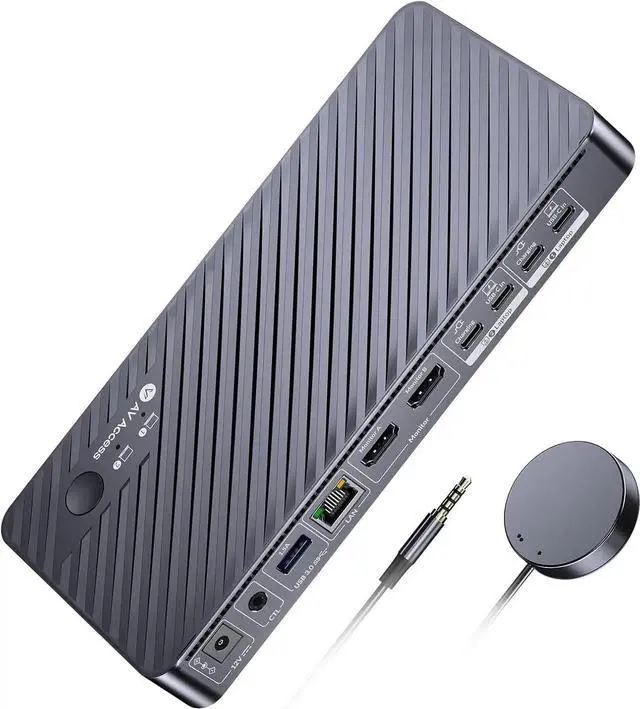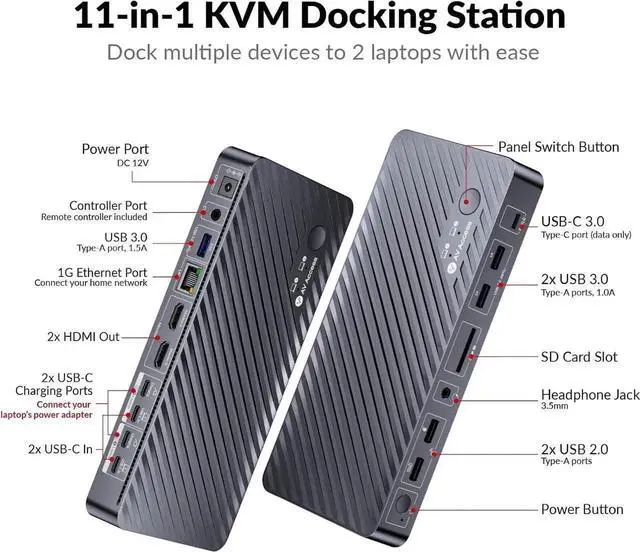 USB-C MST & 100W Charging Each USB-C (MST) input port is designed with an adjacent USB-C charging port for dual 4K video output, 5Gbp/s data transmission, and simultaneous 100W laptop charging (original laptop power adapter required).