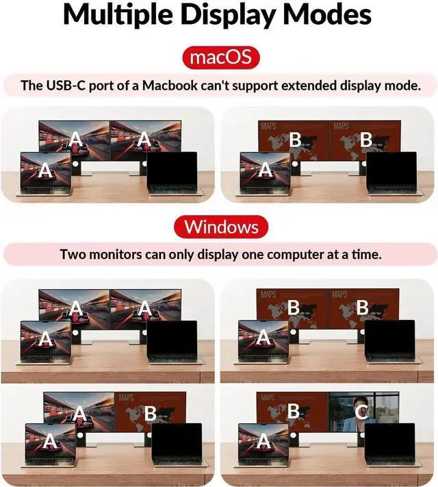 Note: Certain USB-C laptops, especially those with integrated graphics, may not support dual 4K video output. Verify your laptop's video output capabilities.