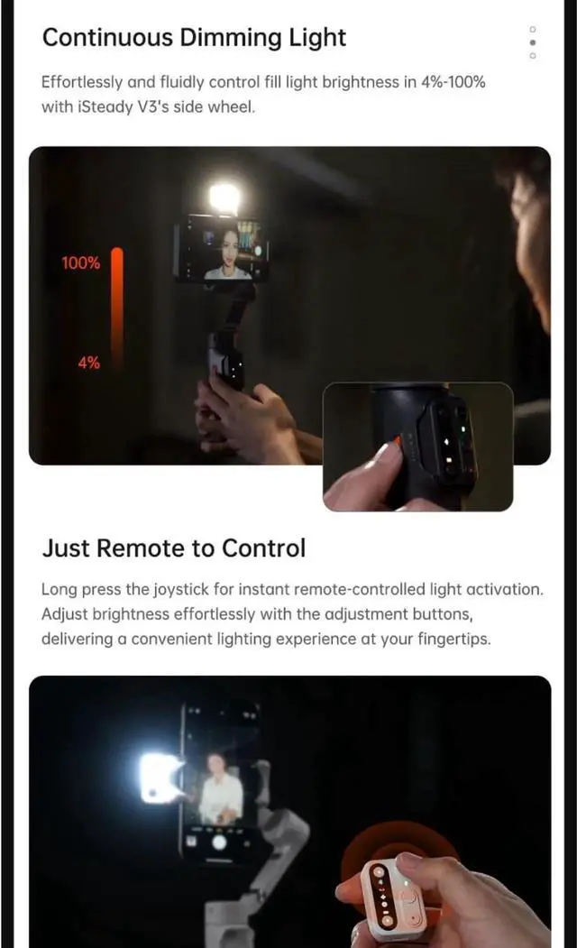- Light Up Your Vision in the Darknesshohem iSteady V3's newly upgraded fill light gives you an unbeatable lighting effect that enables a peak iluminance of 110 Lux. Efortlessly and fluidly control fll light brightness in 4%-100% with iSteady V3's side wheel. Double press the wheel, switch between cool, warm, and neutral light effortlessly, perfecting every scene.
