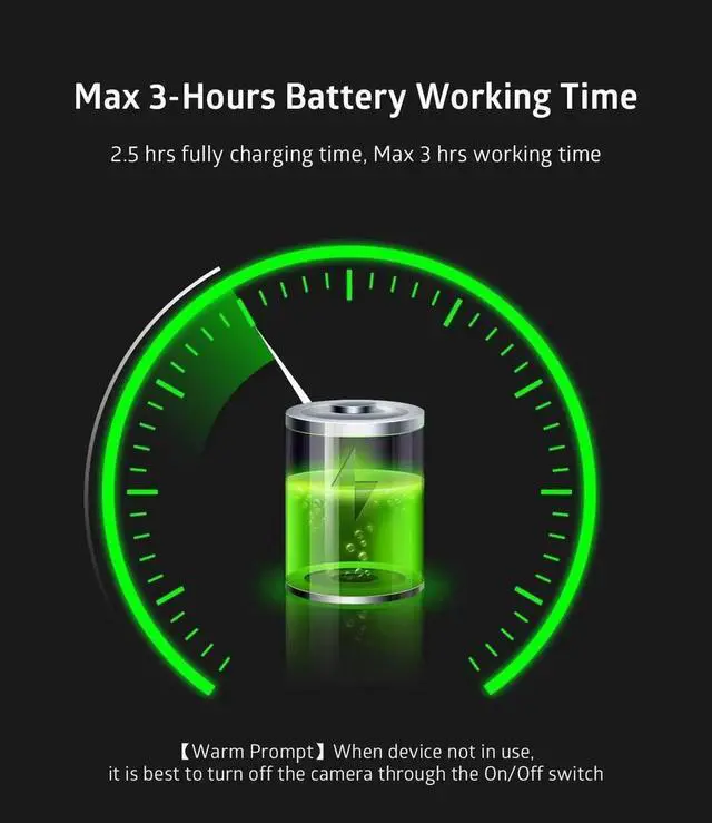 Max 3-hours Battery Working TimeBuilt-in a rechargeable 1500mA lithium battery, 2.5 hrs fully charging in shutdown state and get max 3 hours working time. Warm PromptThe device is not fully charged when it leaves the factory.