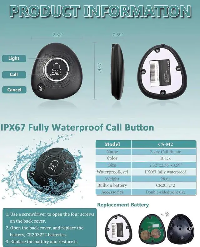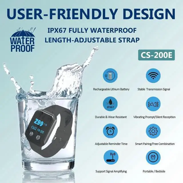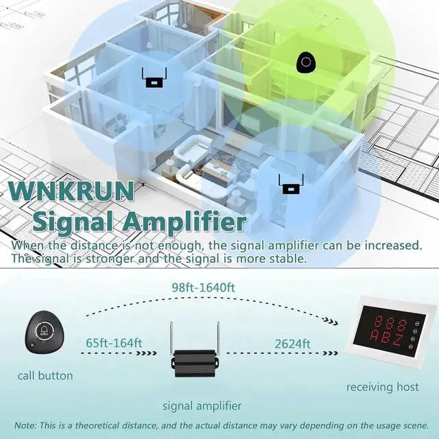 - WATERPROOF CALL BUTTONS: The caregiver call buttons are in IPX67 waterproof quality, and this wireless queue calling systemsignal range covers 400m/1312ft in an open area outdoor. Walls and other objects may decrease transmission range, the indoor signal range is about 50-100m/164-328ft, practical distance depends