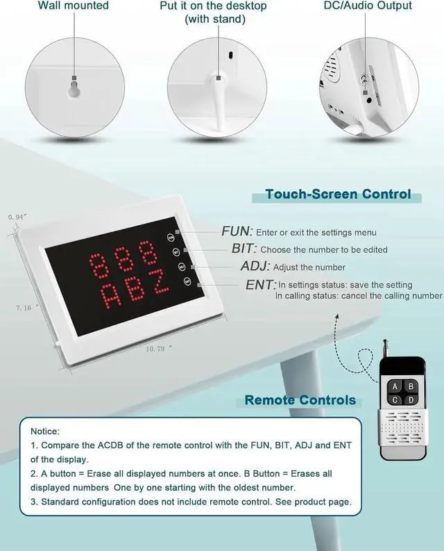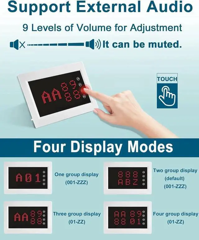 - MASSIVE CAPACITY: The display receiver of this wireless call system is compatible with 200 call buttons in different numbers named from 001 to ZZZ. It can support the combined display mode of numbers and letters. Alphabet supports 26 English letters