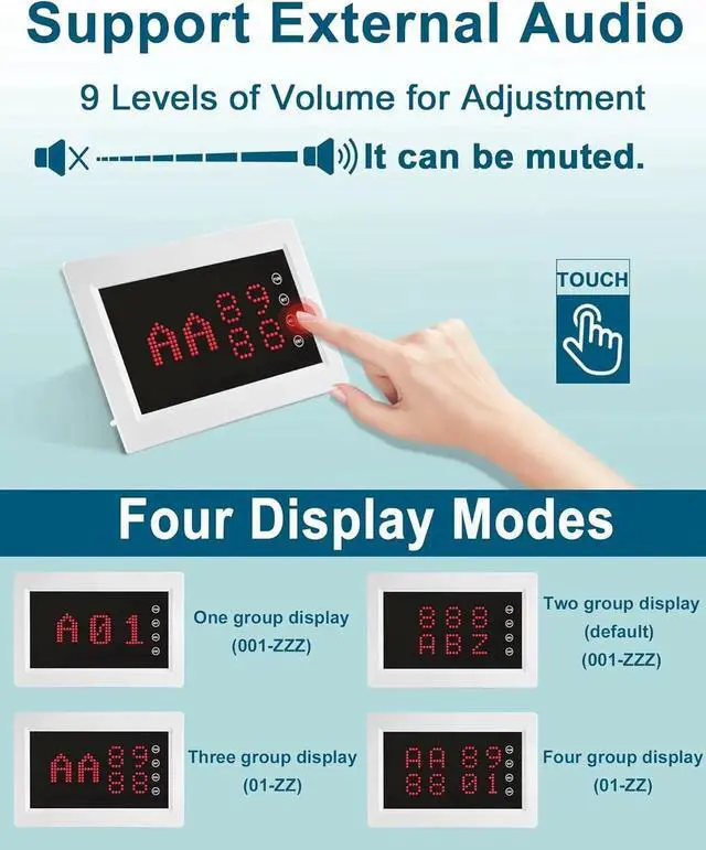 - MASSIVE CAPACITY: The wireless call system is compatible with 200 call buttons in different numbers named 001 to ZZZ. It can support the combined display mode of numbers and letters. The number supports 26 English letters