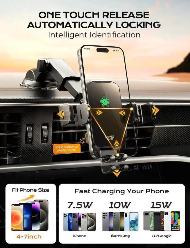 INTELLIGENT IDENTIFICATION AUTO CLAMPING: This wireless car charger is equipped with the latest intelligent recognition automation technology. With the help of it, your phone will be immediately recognized and fixed in 0.5 seconds without any manual intervention. The design of the three claws on the left, right, and bottom, combined with the intelligent recognition system, enables it to perfectly adapt to phones of different sizes, always providing a stable grip.