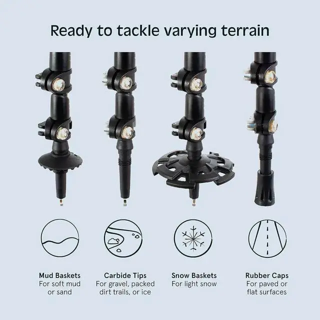 - STABILITY & CONTROL: Lightweight trekking poles for snow with terrain-specific attachments keep you balanced on any surface. Adjustable heights ensure a custom fit for your adventures