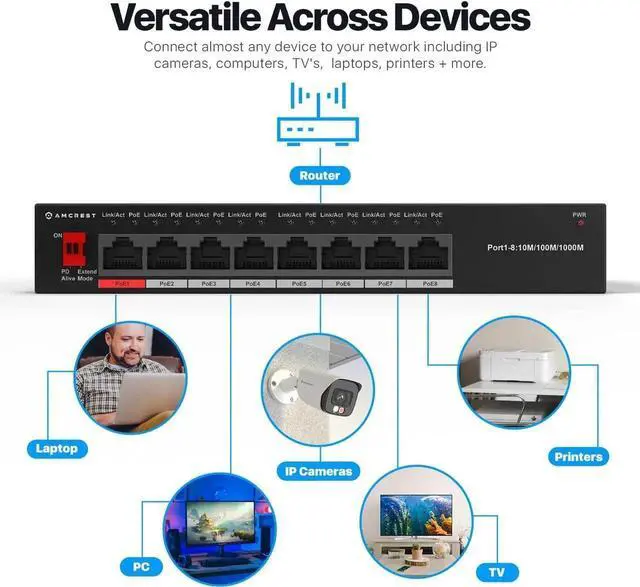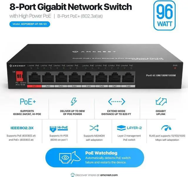 PoE SWITCH FEATURES: 8 x 10/100/1, 000Mbps PoE Ports.
