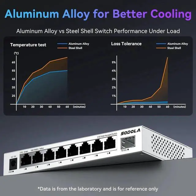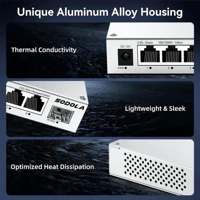 - Aluminum Alloy Cooling 2.5 b Managed SwitchUpgraded aluminum alloy housing reduces heat by 40% vs. steel, ensuring consistent 2.5G bE switch speeds with low packet loss. Fanless, silent design perfect for noise-sensitive spaces.