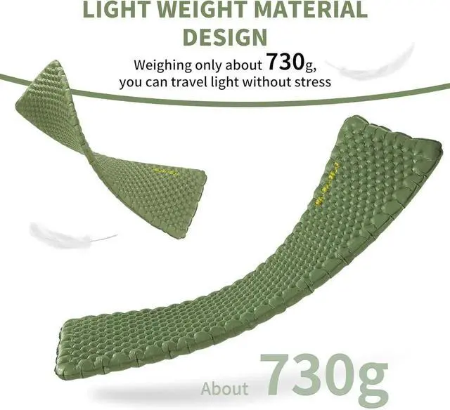 ULTRA-LIGHTWEIGHT MATERIAL: 20D nylon + TPU, TPU has better wear resistance, low temperature resistance, and resilience. Sleeping Pad only 730g/ 25.8 oz (Includes outer box and storage bag), storage volume only 13 * 20cm/ 5.1 * 7.9 inch, suitable for lightweight camping or hiking. Excellent thermal insulation to weight ratiofalseCOMFORTABLE
