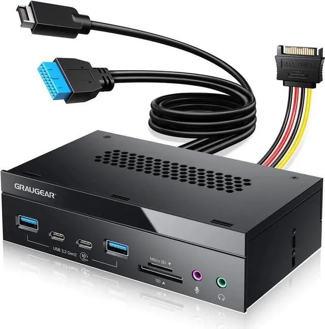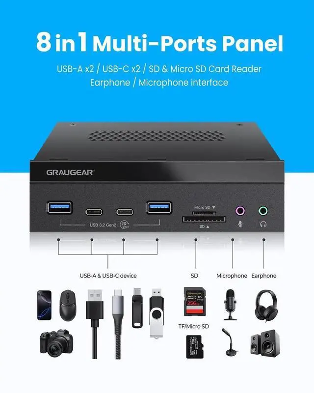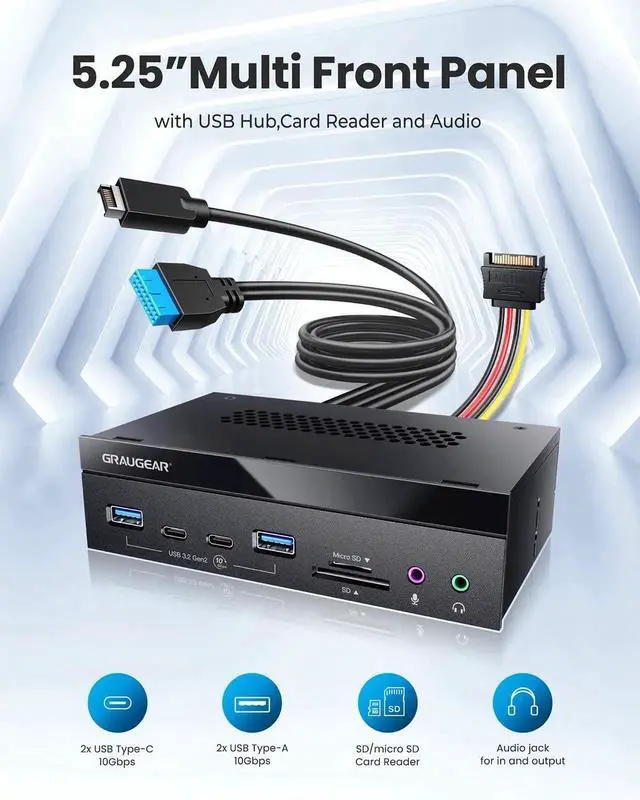 Package Contents 5.25 front panel usb hub with internal card reader, screws, USB 3.2 Type-E Key-A 20-Pin Header and USB 3.0 19-Pin cables, instruction manual and friendly customer service