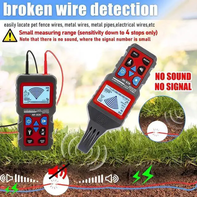 6. NF-826 Underground Wire Locator is an electronic device for detecting and underground locating cables, pipeline wires, cables, or other buried installations Invisible Underground Irrigator, Pet Pen Locator. Integrating accurate voltage detection, signal tracing, electrical systems, power cable locator, such tools are commonly used in electric utilities, utility testing, communications companies, building and construction units, home improvement services, and municipal management, utility management, horticulture and landscape engineering government departments, gardens, parks, and also used in large farms, greenhouses, and other places in the and other industries