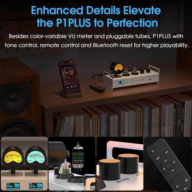 Elevate the P1 PLUS to Perfection: It features tone knobs allowing for precise tuning of bass and treble; a remote control to adjust all settings at your fingertips; a color-vari VU meter that complements various listening spaces; and a sleek metal body that seamlessly blends retro charm with modern design.