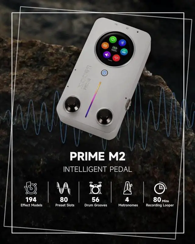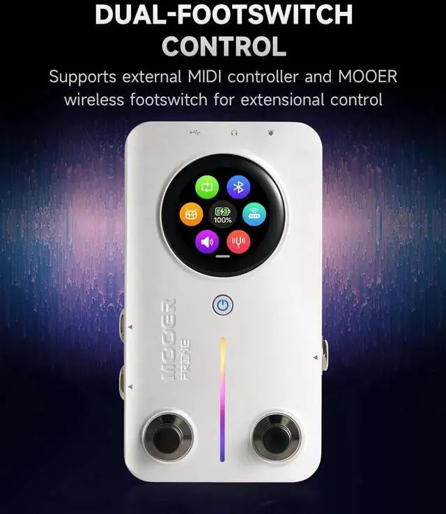 Powerful Tripartite Performance Supports loading MNRS sample files and third-party IR sample files. Through the MOOER PRIME app you to upload your own sounds and share them with other users; and you can download MNRS speaker sample files from the cloud to use in the M2 effect chainfalseMultiful Interfaces Supports Bluetooth audio playback, OTG recording, Dual-channel stereo output, headphone output for silent practicefalseBattery Life Built-in rechargeable lithium battery. Charging Standard DC 5V/2A. It can be used for 6 hours on a full charge. Get rid of the wired bondage. Portable to go out and practicefalse- New DesignThe touch screen is combined with dual-footswitch controlsupports external MIDI controller and MOOER wireless footswitch for extensional control