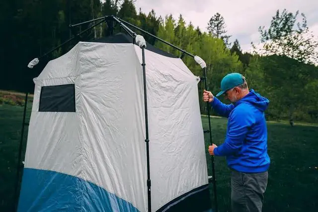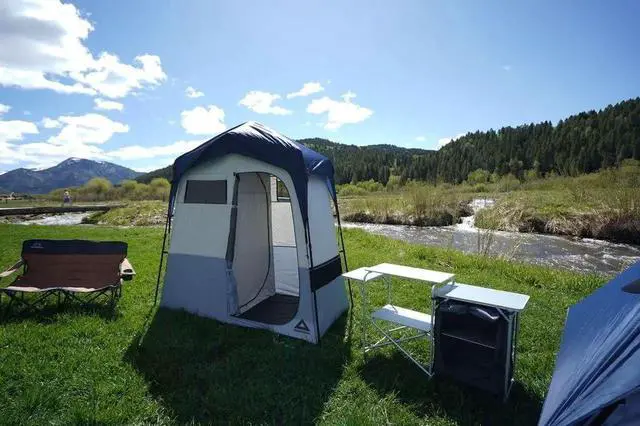 Convenient Design: This camping tent includes a mesh roof for ventilation, zip-up windows, a door with privacy screen, 6 interior and exterior storage pockets, a removable hanger for towels, and a heavy-duty ceiling hanger for portable shower (shower not included).