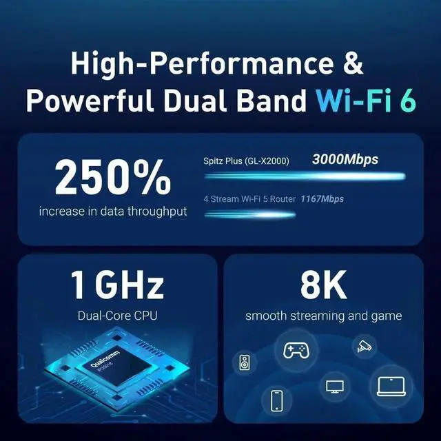VPN Tunnelling & Remote AccessProvides pre-installed OpenVPN and WireGuard to support 30+ VPN services and encrypts all network traffic within the connected network so that the network is secured when connecting to a public Wi-Fi. Max. VPN speed of 30 Mbps (OpenVPN); 190 Mbps (WireGuard) *Speed Tests conducted on a local network. Real world speeds may differ depending on your network configuration. falseInterchangeable SMA ConnectorsThe GL-X2000 features four SMA connectors, allowing for the integration of multiple external antennas to enhance the device's performance across various application scenarios. false- Fast Wi-Fi 6, 3000M wireless speedGL-X2000 provides reliable cellular networks for remote access and high speed internet in urban areas with up to 574Mbps ( 2.4GH z) + 2402Mbps (5GHz) Wi-Fi speeds.