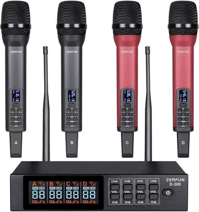 1. Genuine ZERFUN Wireless Microphone products come with supportive 24-Hours After-Sales Customer Service, 12-month Manufacturer Assurance. - 4 RECHARGEABLE WIRELESS MICROPHONES WITH LCD RECEIVER: ZERFUN D-300 UHF Wireless Microphone System Professional that comes with four rechargeable handheld cardioid microphones and metal receiver box with with Independent Volume Control, Frequency Lock, 4x50 Adjustable Frequency, 1/8, 1/4, XLR Output. Perfect for home karaoke, meeting, party, church, DJ, wedding, and much more.