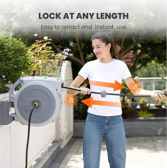 Any Length: Giraffe retractable garden hose reel is pre-installed with a 1/2 125 ft hybrid hose and 5 ft leader hose, which can lock at any length as you want, covers every corner of your garden.