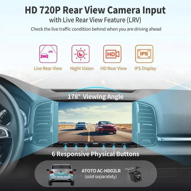 - Live Rear-View & Customer SupportLRV offers a real-time rear-view even when driving forward (ATOTO AC-HD02LR camera required), free from the obstructions behind you inside the vehicle. A6 PF can process 720P HD rear-view camera input (other car stereos can only connect to cameras of 480-600 lines). ATOTO's professional customer support team is there for you to solve any problems concerning the installation, operation, etc. of your ATOTO products. Get continued system updates when availabl