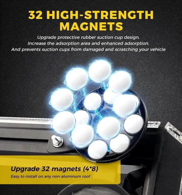 - Easy Installation: Strobe lights are equipped with 32 super powerful magnets and larger, thicker rubber suction cups. They're more stable than 4 x 4 magnets. They can be easily and quickly installed on metal vehicle roofs and have stronger adsorption