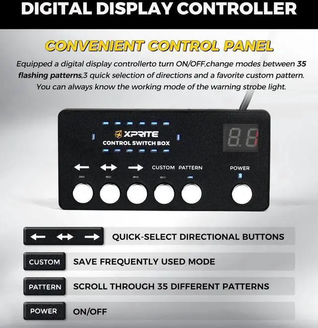 - Flash Patterns: The controller equipped with our strobe light bar has six button switches, enabling 35 different flashing modes. Moreover, this strobe light has a memory function, allowing you to save your favorite mode for fast emergency response