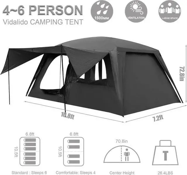 GOOD VENTILATION & SCENIC VIEWS OF THE OUDOORS: This 4-6 person tent has 3 mesh doors, 2 mesh windows & mesh tent top, which allow the breeze to come in and keep the bugs out. Top large mesh roof makes it available to watch stars with a wide view at night.