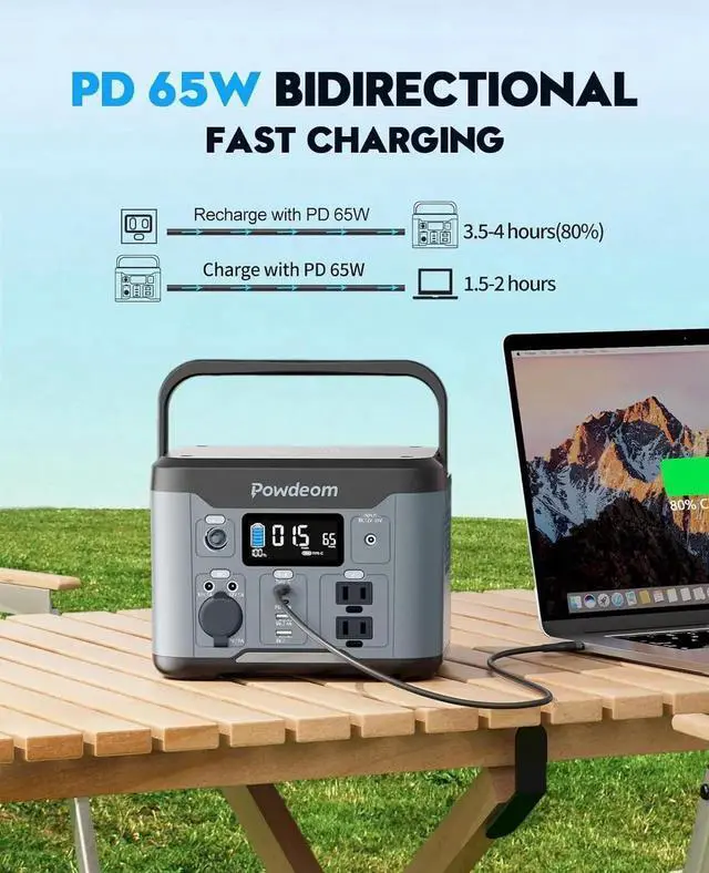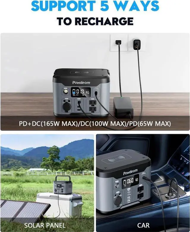 5 RECHARGING WAYS: power bank with outlet can be recharged by a wall outlet, PD port, car charger or 60w solar panel, even wall outlet and PD port charging together. No matter whether you are outdoors camping, taking a trip, or at home resting, it can be charged and fully used, keeping you stay connected to unlimited energy.