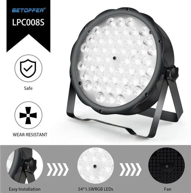 Easy InstallationCome with 2 brackets and screws, this stage light can stand on the floor with adjustable lighting angle to use as a uplight for washing. Or hang on truss as a downlight to highlight the actor on the stage or as a stage lighting. false- RGB 3-in-1 Slim Party LightEach LED is equipped with RGB 3-in-1 beads, this stage light has 54 LEDs, by color blending and brightness adjusting, you get marvelous colors and stunning lighting effect for your different applications like wedding, home party, mobile dj, gigs etc.