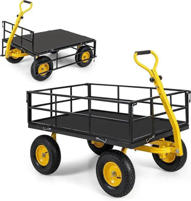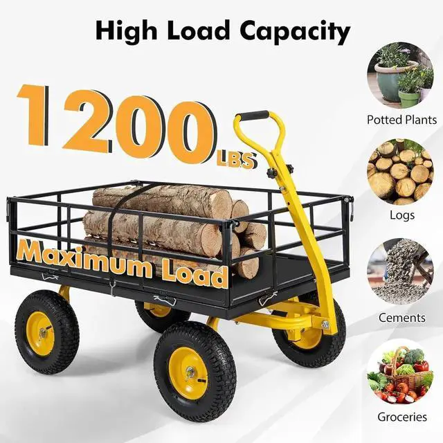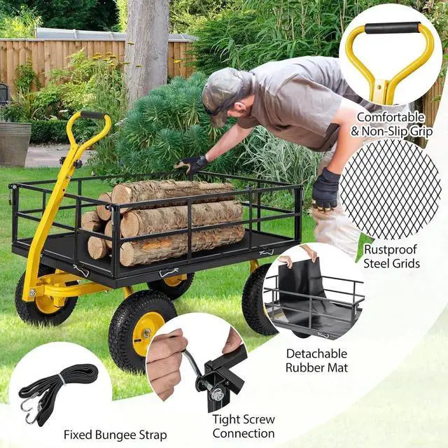 Are you looking for a reliable and practical garden cart? Look no further! Our 3 in 1 utility garden cart can be removed the sides and use it as a platform cart to accommodate items of various sizes. With a high load capacity of up to 900 lbs/1200lbs, this sturdy steel cart is perfect for transporting potted plants, logs, cement, groceries, and more. Besides, it comes with 10"/13 reliable tires to fit asphalt, cobbled roads, lawns, and muddy terrains. The adjustable U-shaped pull handle offers easy maneuverability, while the non-slip and comfortable grip ensures a pleasant operation. Hence, this cart ensures seamless functionality for all your transport tasks.