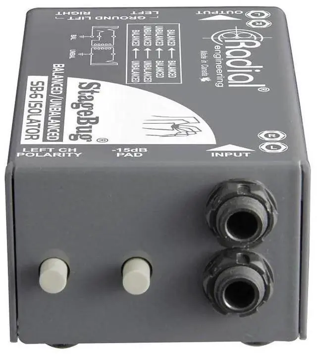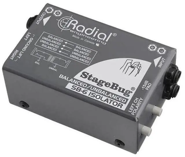 Automatically configures for hi-Z or lo-Z signal chainsfalseThe Radial StageBug SB-6 is a high performance 2-channel passive audio isolator designed to accommodate both balanced and unbalanced signals and work effectively at eliminating noise when used with instruments, consumer electronics as well as professional line-level devices. The design begins with ¼" TRS inputs and outputs to accommodate both TRS and mono type connectors. The unique circuit retains the balanced signals or automatically converts them from hi-Z to lo-Z (¼" mono to TRS) or lo-Z to hi-Z (1/4"TRS to mono) depending on the connector in use. You simply connect and the SB-6 does the work for you! Inside are two ultra-linear Eclipse transformers that sound great as they deliver ruler flat performance from 20Hz to 20kHz.
