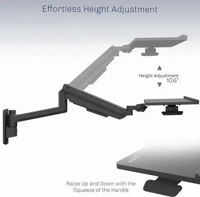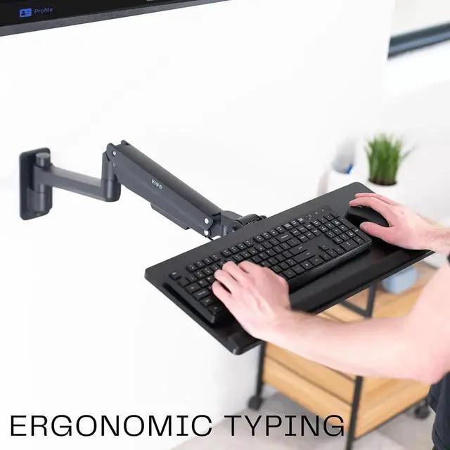 Pneumatic Wall Mounted Keyboard TrayDesigned to make your workstation more ergonomic, this floating keyboard tray provides adjustable tilt, swivel, and height for a personalized typing experience. Built-in pneumatic spring assist makes height adjustments possible at the touch of a hand, and the locking mechanism will hold your desired setting securely in place.