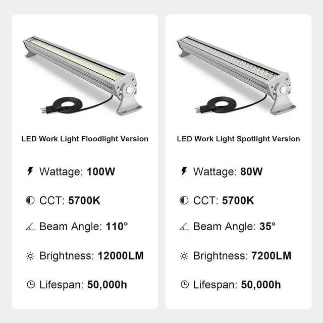 Version): Our 100W LED work light features a wide floodlight pattern (110° beam angle) that evenly illuminates large areas. The 12000LM ultra-bright shop light is very suitable for warehouses, loading bays, or outdoor job sites, eliminating shadows and providing uniform coverage across your entire workspace