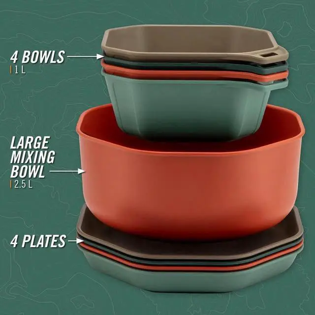 Gerber Gear ComplEAT Set: This comprehensive 9-piece set is designed for outdoor dining with plates, bowls, and a versatile mixing bowl