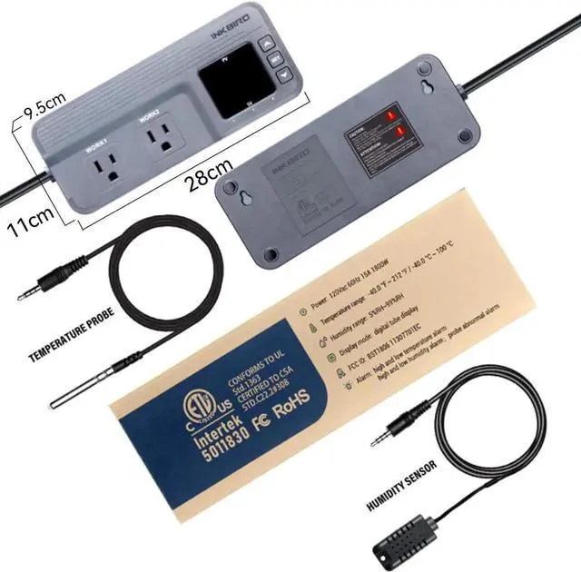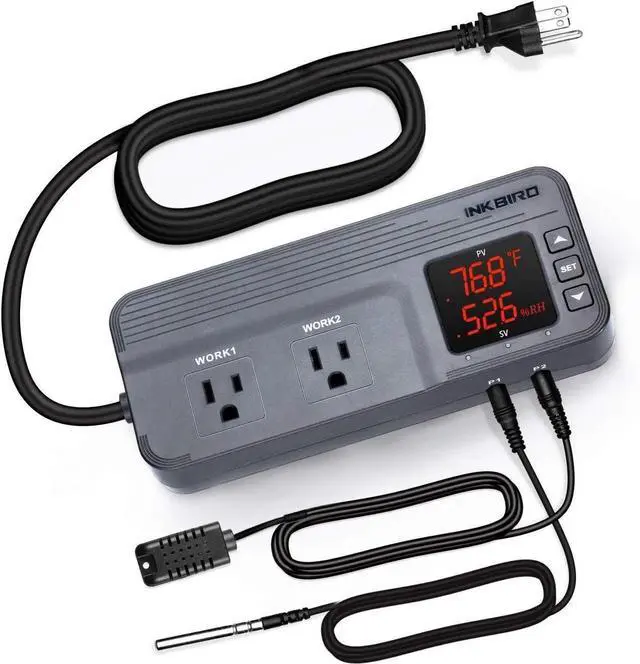 The temperature and humidity controller Supports calibration; Centigrade or Fahrenheit reading; Sets compressor delay to protect your cooling device; Automatically saves the setting parametersfalseWhen plugging the temp and humidity probe: WORK1 outlet for a heating or cooling device; WORK2 outlet for a humidifier or a dehumidifier; Automatically ON or