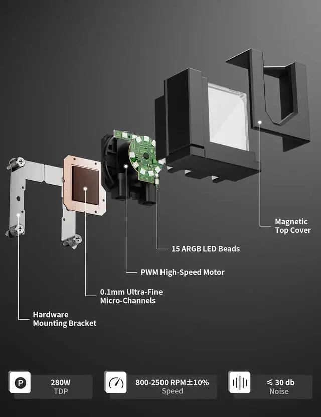 Dynamic ARGB LightingElevate your setup with 15 ARGB LED beads embedded in the pump head and ARGB-equipped fans, delive vibrant lighting effects. Customize colors and patterns via compatible software to create a uniquely immersive visual experience, transforming your PC into a dazzling centerpiece for gaming or creative projects.