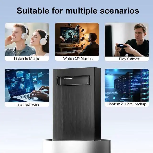 External Hard Drive EnclosureThe blu ray drive external includes an external hard drive enclosure at the top of the device. This enclosure is specifically designed to accommodate both 3.5 and 2.5 SATA// hard drives, allowing you to use your external hard drive to access your desktop or laptop directly without having to purchase a new HDD enclosure. This feature is especially useful for those who frequently transfer files between devices or need additional storage space that can be easily accessed and shared between different computers. With the external hard drive enclosure, you can enjoy easy and convenient access to your data with a simple plug-and-play setup.