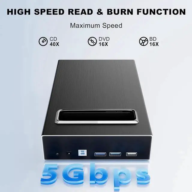 High-performance Bluray CapabilityThe blu ray burner offers faster reading and recording speeds than other standard blu ray drive. Its individual power allows for Bluray reading speeds up to 16x, DVDs up to 16x, and CDs up to 40x, which is 2-3 times faster than most normal blu ray drives. It also supports burning capabilities for 8.5G, 4.7G, and 700M CDs and DVDs.