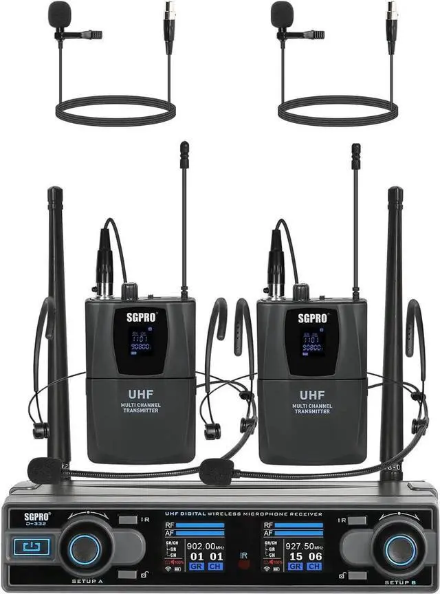 Dual Channel Wireless Microphone System with Two Bodypack Transmitters, Two Headset Micriophones and Two Lavalier Mics for Live & Recording of Sining and Speaking (D-332BB)