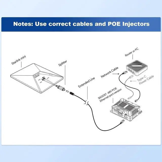Clean Installtion: The Starlink Mini PoE Injector includes USB-A and USB-C power outputs for powering gigabit routers. By eliminating unnecessary cable and port, the device ensures a clean, organized, and efcient environment.