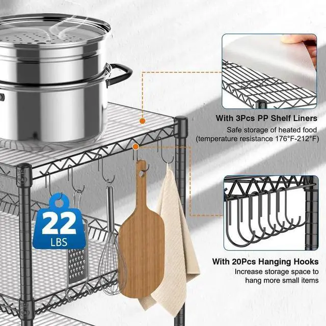 Bonus Hanging Hooks & Shelf Liners: Our 3 tier rolling cart is equipped with 20pcs hanging hooks (3cm), convenient for you to hang kitchen items or other gadgets for quick use. Include 3pcs extra PP shelf liners, you can place heated food on it without any hassle (high temperature range of liners is 176-212°F).