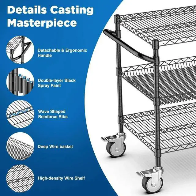 wheels: 360-degree flexible rotation, easy transportation and labor-saving. Simple 3 tier wire storage cart structure, all parts are in the package, no tools required to assemble.