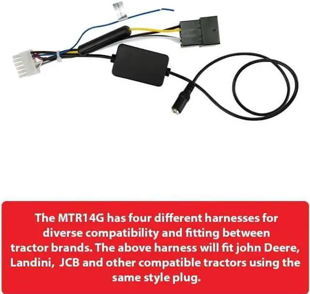This unit is compatible with multiple models of John Deere, JCB, Landini, YANMAR and McCormick tractors. Please ensure that the plug inside of your tractor matches one of the plug options as pictured.