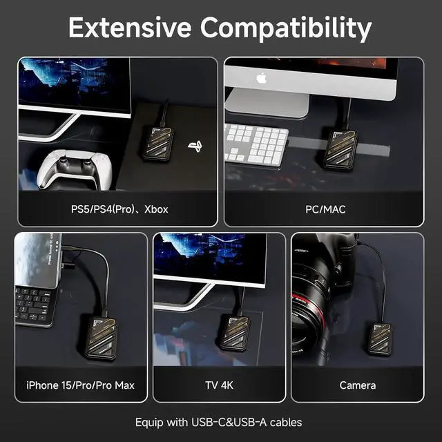 Wide Compatibility Across Devices: This portable external SSD is compatible with traditional laptops, desktops, TVs, and PS5, PS4 (Pro), and Xbox series. 1TB external ssd also works seamlessly with Macs 10.9 and Windows 7 or higher, as well as select Android with OTG functionality (Also compatible with Thunderbolt 3/4, USB 3.2, USB 3.0 and below interfaces)